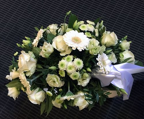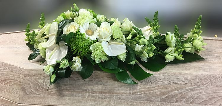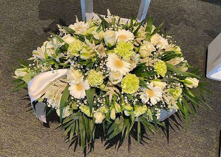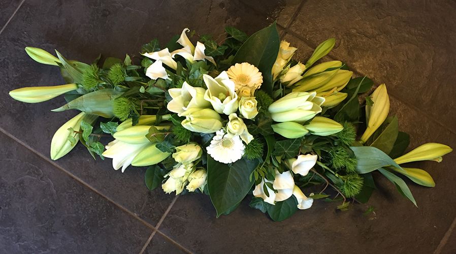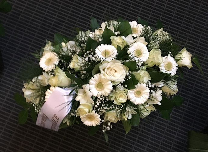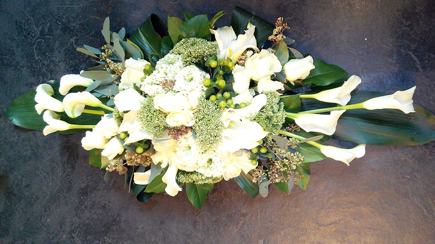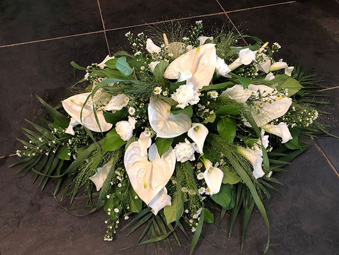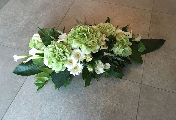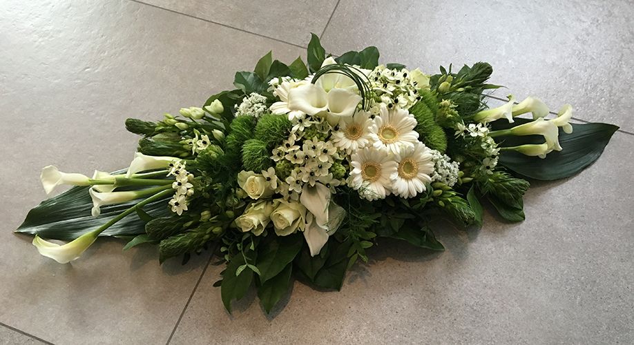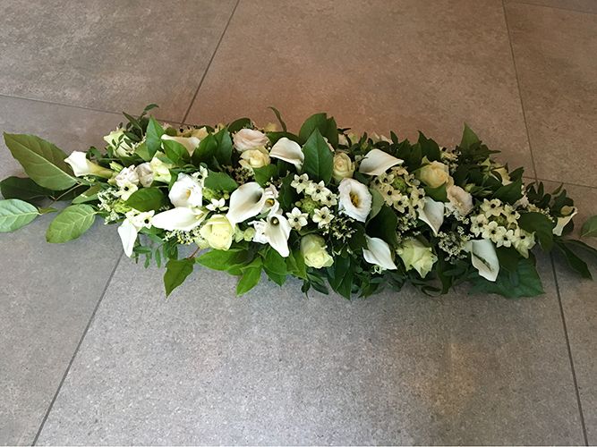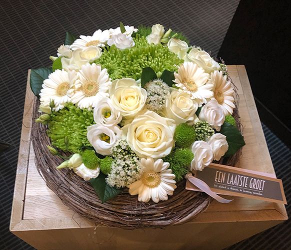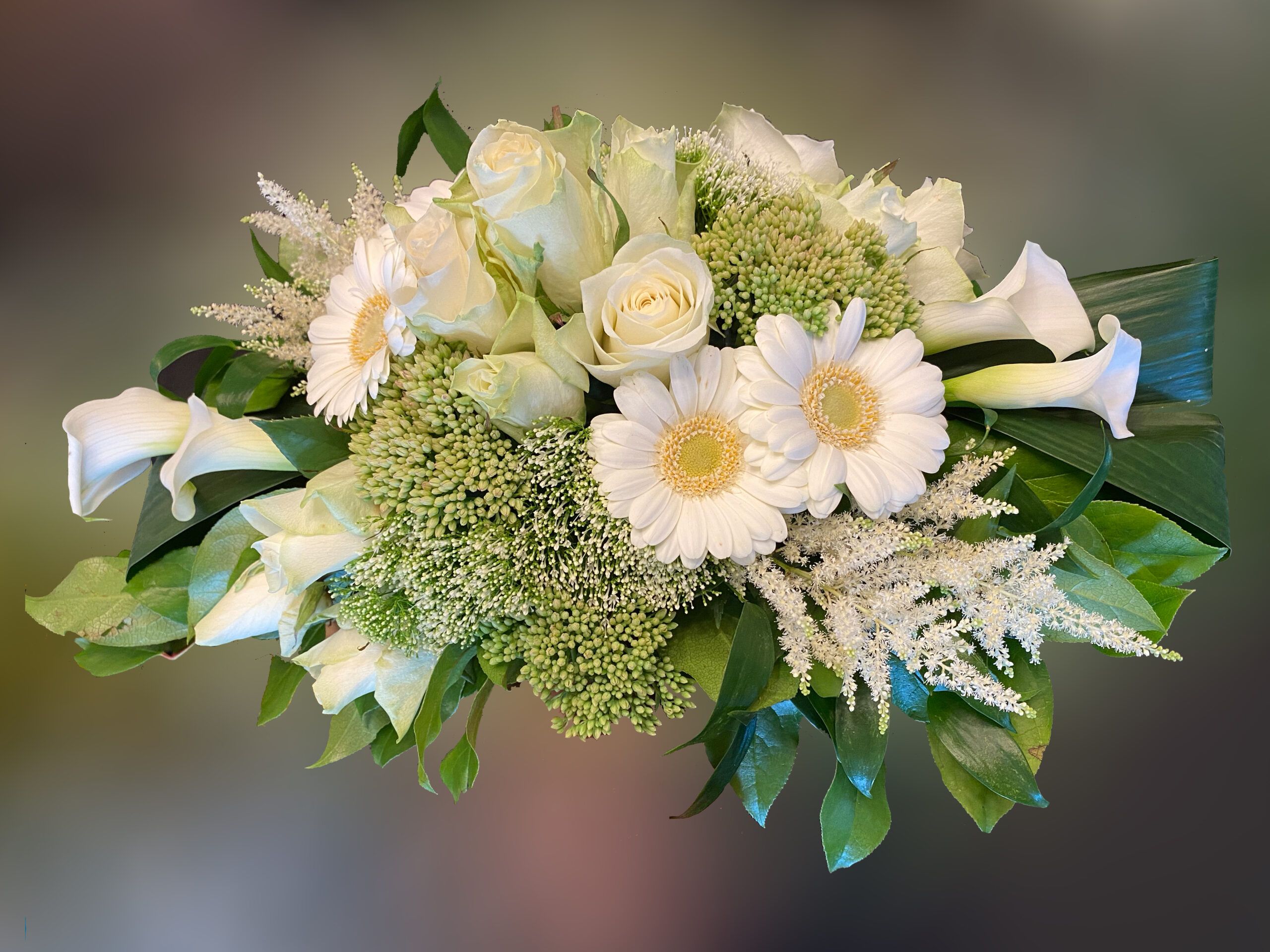 Een prachtig bloemstuk met witte bloemen als eerbetoon aan een dierbare overledene. Dit bloemstuk is zorgvuldig samengesteld met witte bloemen en aangevuld met groene tinten, waardoor het een rustgevende en serene uitstraling heeft. De witte kleur wordt vaak gebruikt bij uitvaarten als kleur van de hoop.