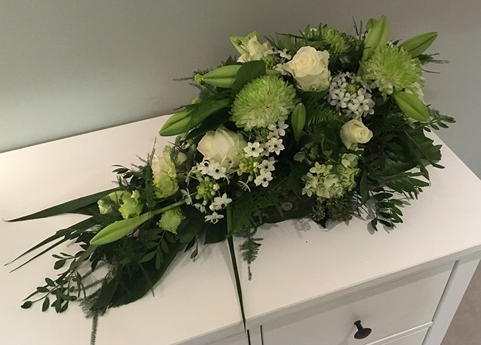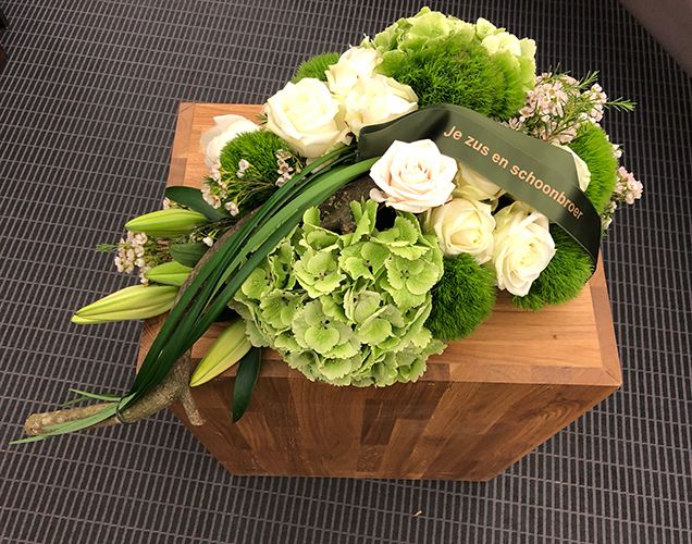 Een prachtig rouwstuk in witte en groene kleuren als eerbetoon aan een dierbare overledene. Dit rouwstuk is zorgvuldig samengesteld met delicate bloemen, waardoor het een rustgevende en serene uitstraling heeft. De bloemiste zorgt steeds voor mooie, verse en marktconforme bloemen voor u.
